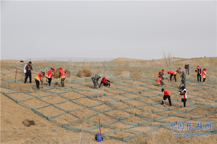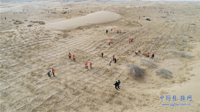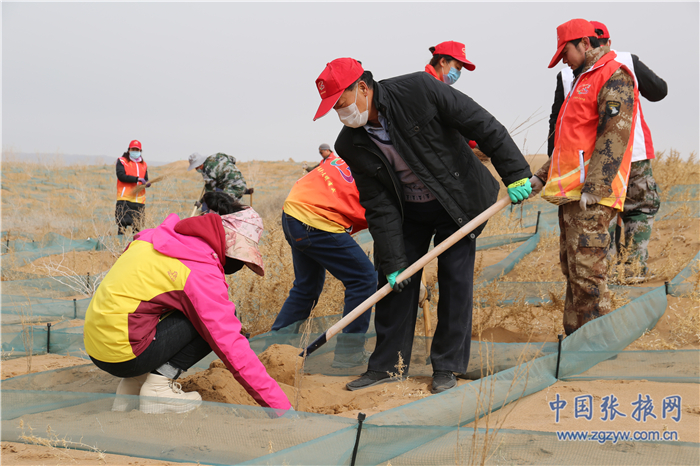 治沙現(xiàn)場,一個個頭戴小紅帽,身穿紅馬夾和白馬夾的身影格外引人注目,該縣新時代文明實踐所組織青年志愿者們也進行義務治沙,為茫茫沙漠增添一片新綠。“作為一名新時代文明實踐志愿者,我很高興能參加今天的壓沙治沙活動,為生態(tài)文明建設作出應有的貢獻,我志愿,我參與,我快樂。”新時代文明志愿者蘭玉說。