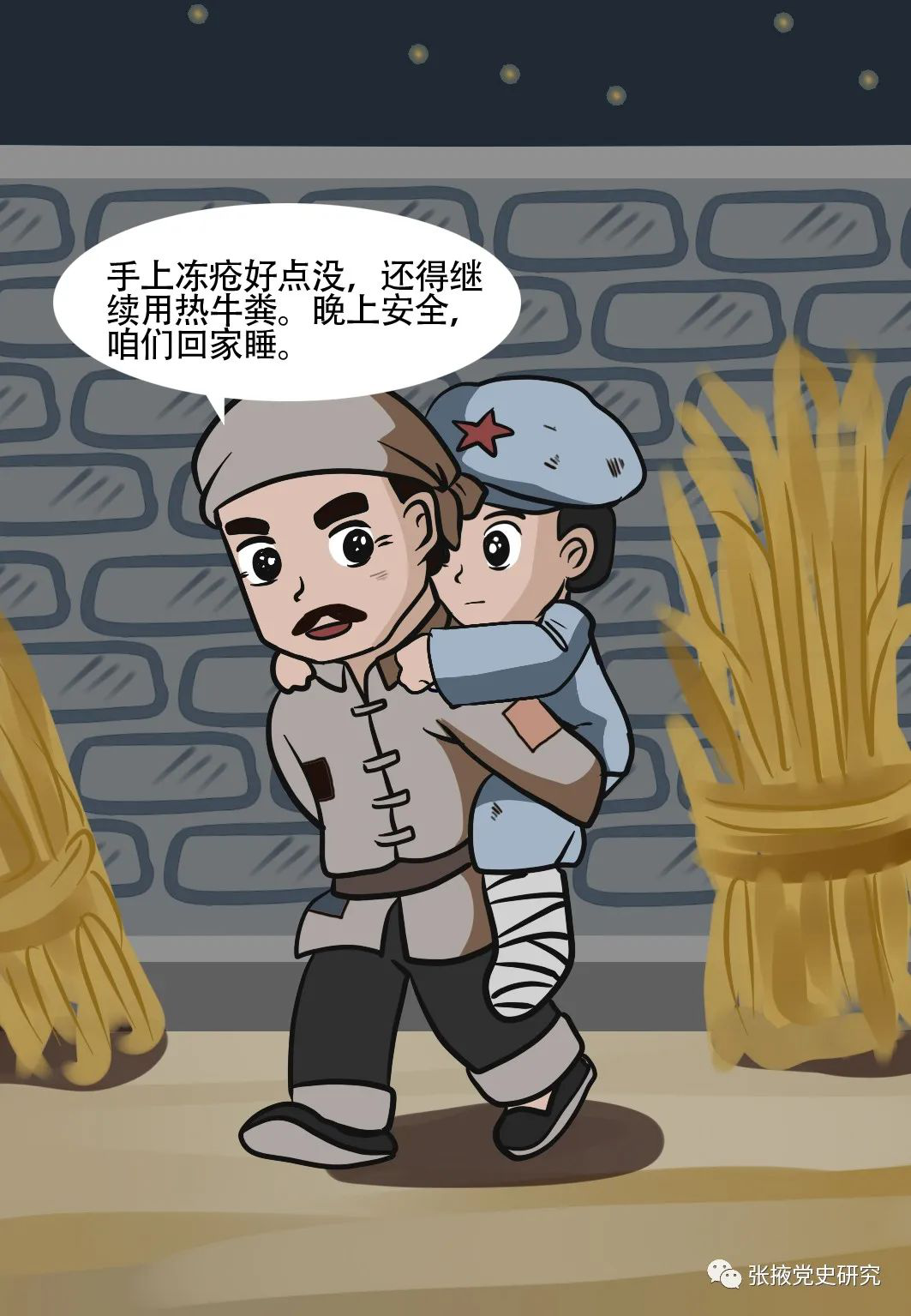 這個小紅軍名叫唐金云,是紅軍部隊中的理發員,掉隊流落時僅有15歲。楊秀清老人讓唐金云去找個地方躲起來,免得再遭不測。同村周丕國看唐金云手腳凍傷不能繼續行走,加之馬匪當時大肆搜查,全村人誰都不敢收留。周丕國冒著犧牲一家人性命的危險主動把唐金云領回自己家里,并讓他吃完飯后和他一起睡在熱炕上。