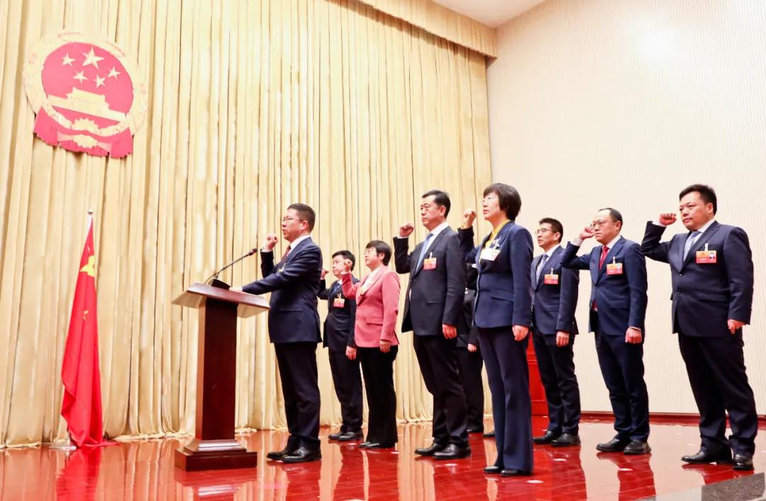 宣誓儀式現場莊重、嚴肅。趙立香、王海峰等宣誓人面向國徽,右手舉拳,高聲誦讀誓詞:“我宣誓:忠于中華人民共和國憲法,維護憲法權威,履行法定職責,忠于祖國、忠于人民,恪盡職守、廉潔奉公,接受人民監督,為建設富強民主文明和諧美麗的社會主義現代化強國努力奮斗!”