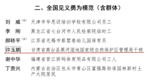 2011年12月,許玉鵬退伍,次年12月被分配到高臺縣黑河濕地國家級自然保護區(qū)管理局工作。在單位,許玉鵬嚴格遵守各項規(guī)章制度,保持嚴謹認真的工作態(tài)度和一絲不茍的工作作風(fēng),始終奔波在保護區(qū)的角角落落,從檢查維修管道到灌溉施肥,從整地保墑到苗木移栽,從病蟲害防治到疏松除草,保護區(qū)不少地方留下了他的身影……