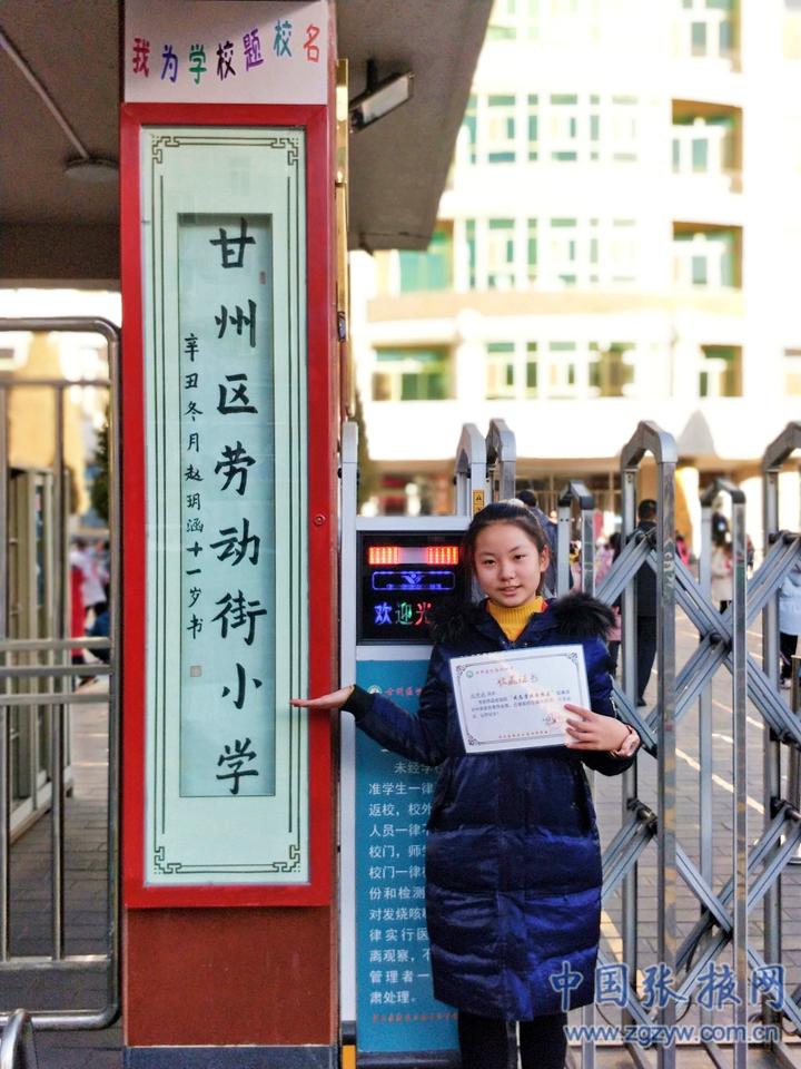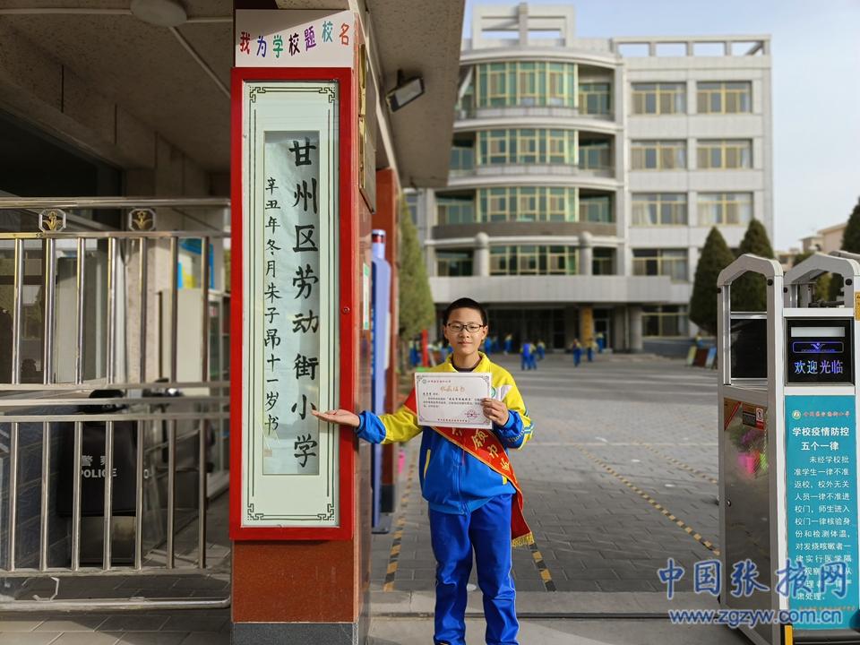 中國張掖網訊 這幾天,張掖市甘州區勞動街小學六年級1班的祁跡同學每天上下學時,都會在學校門口駐足一會兒,原來,學校門口掛上了自己書寫的“甘州區勞動街小學”幾個大字,祁跡很是開心:“這是一件光榮的事,寫書法可以讓我靜下心來,今后我會繼續努力練習的。”