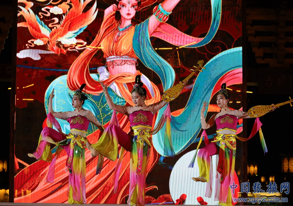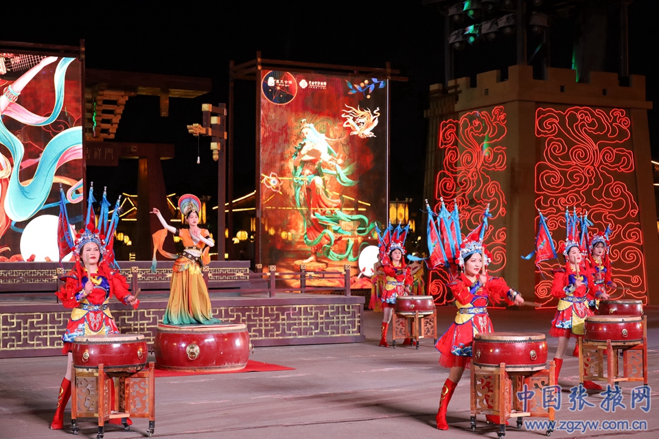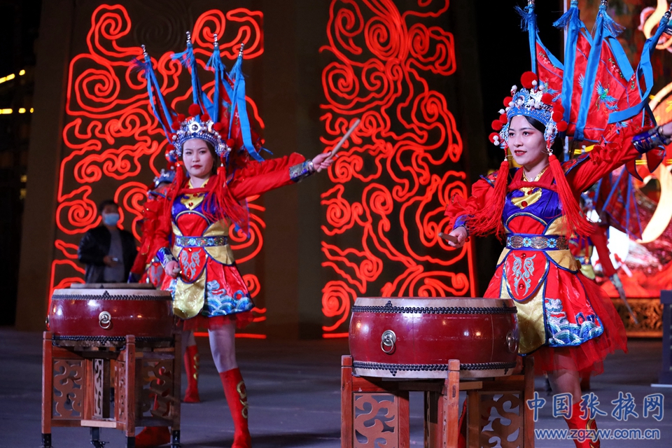 中國張掖網訊 隨著一陣激昂歡快的鼓聲,5月1日晚,張掖市甘州區堿灘鎮屋蘭古鎮九曲黃河燈陣“幻唐情?歡樂宋”歌舞表演正式拉開帷幕。