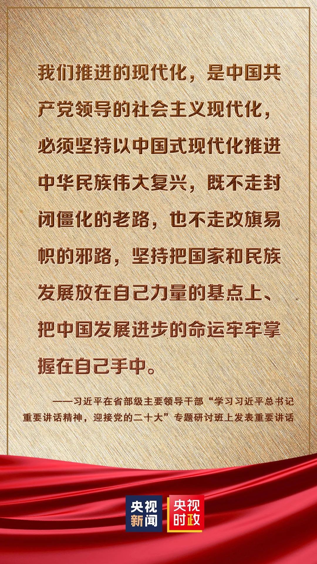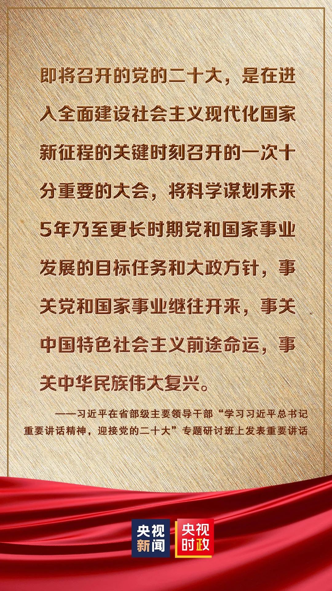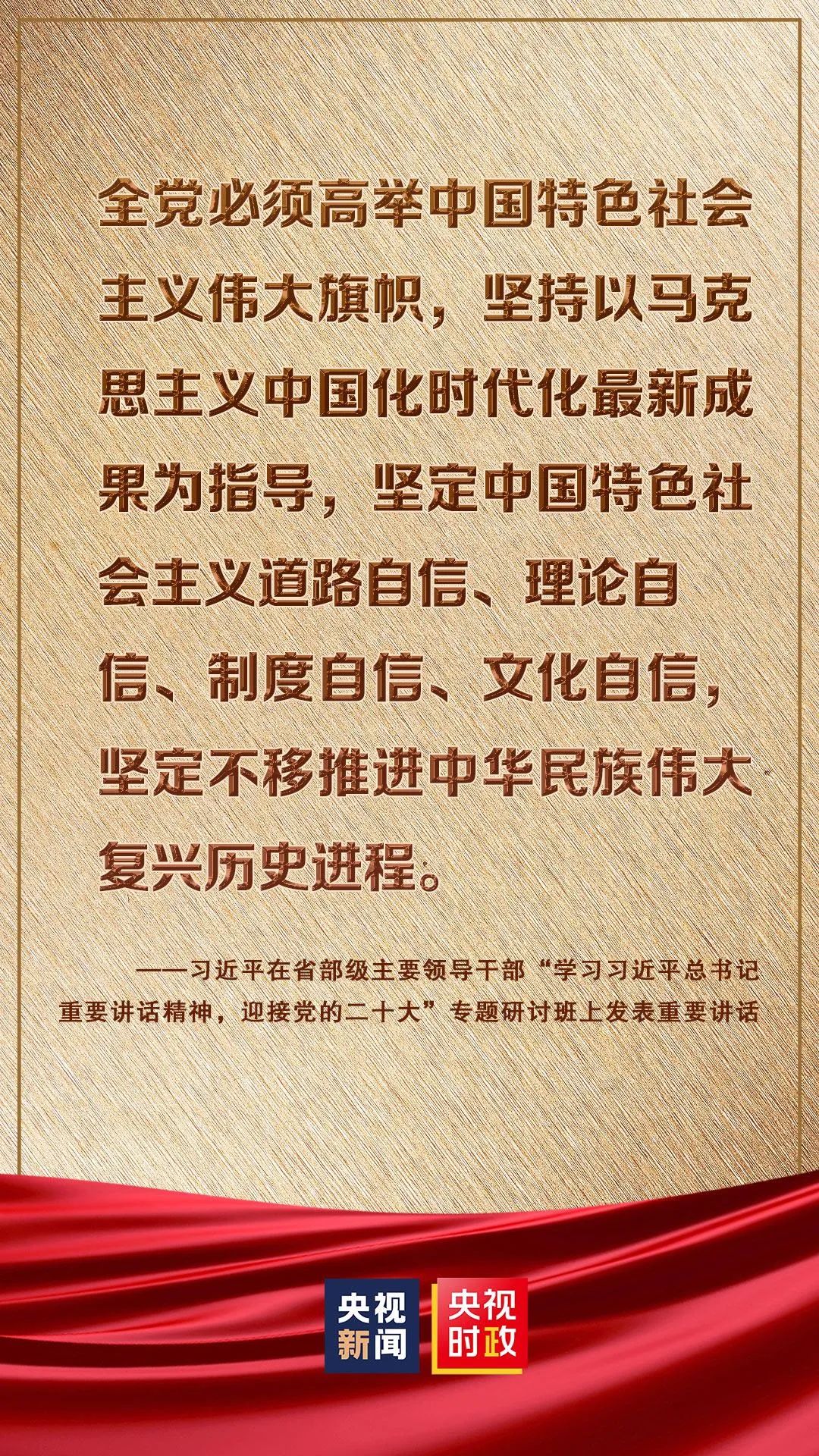 省部級主要領導干部“學習習近平總書記重要講話精神,迎接黨的二十大”專題研討班26日至27日在京舉行。中共中央總書記、國家主席、中央軍委主席習近平發表重要講話強調,在全面建設社會主義現代化國家、向第二個百年奮斗目標進軍的新征程上,全黨必須高舉中國特色社會主義偉大旗幟,堅持以馬克思主義中國化時代化最新成果為指導,堅定中國特色社會主義道路自信、理論自信、制度自信、文化自信,堅定不移推進中華民族偉大復興歷史進程。我們要牢牢把握新時代新征程黨的中心任務,提出新的思路、新的戰略、新的舉措,繼續統籌推進“五位一體”總體布局、協調推進“四個全面”戰略布局,踔厲奮發、勇毅前行、團結奮斗,奮力譜寫全面建設社會主義現代化國家嶄新篇章。
