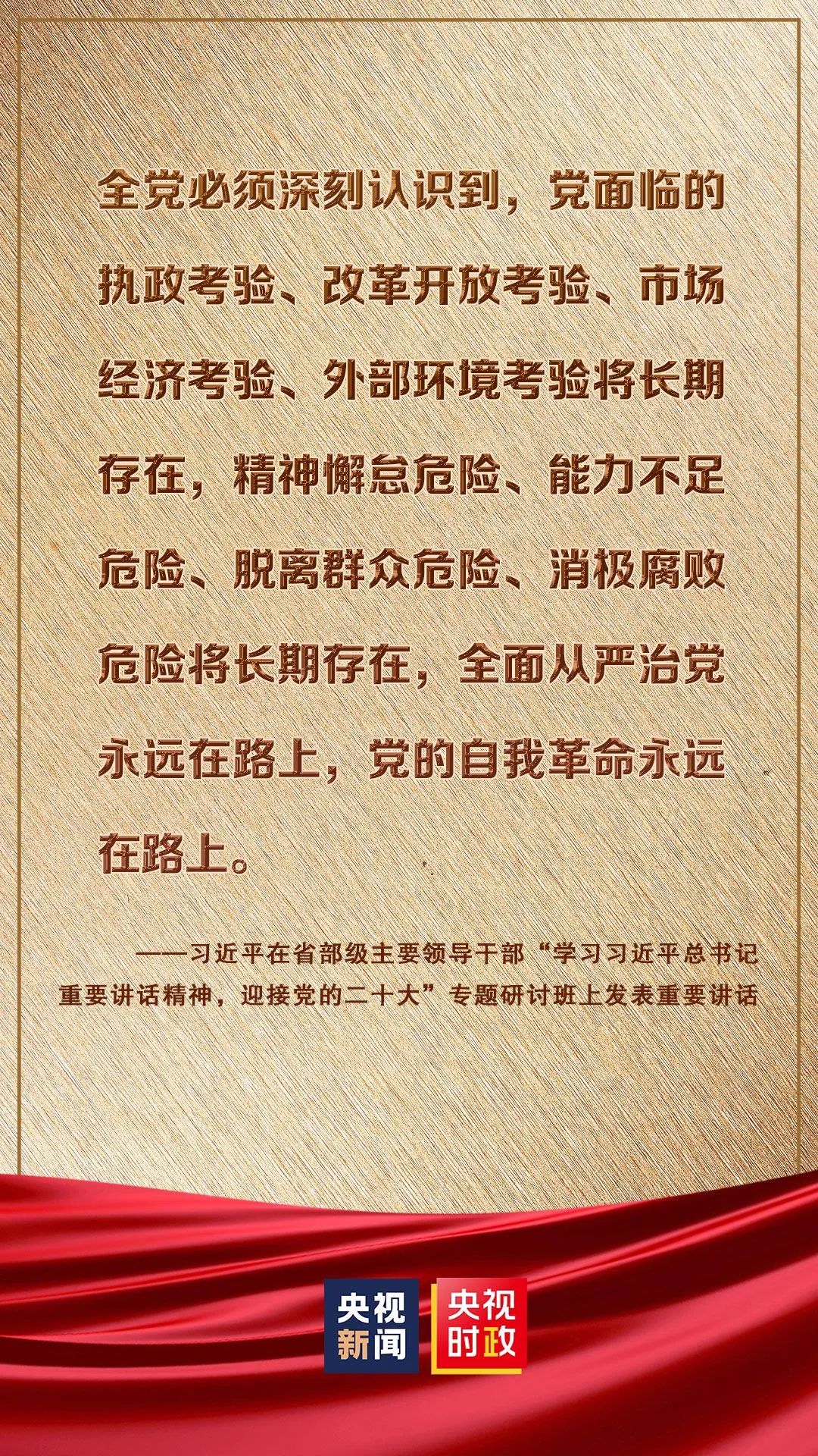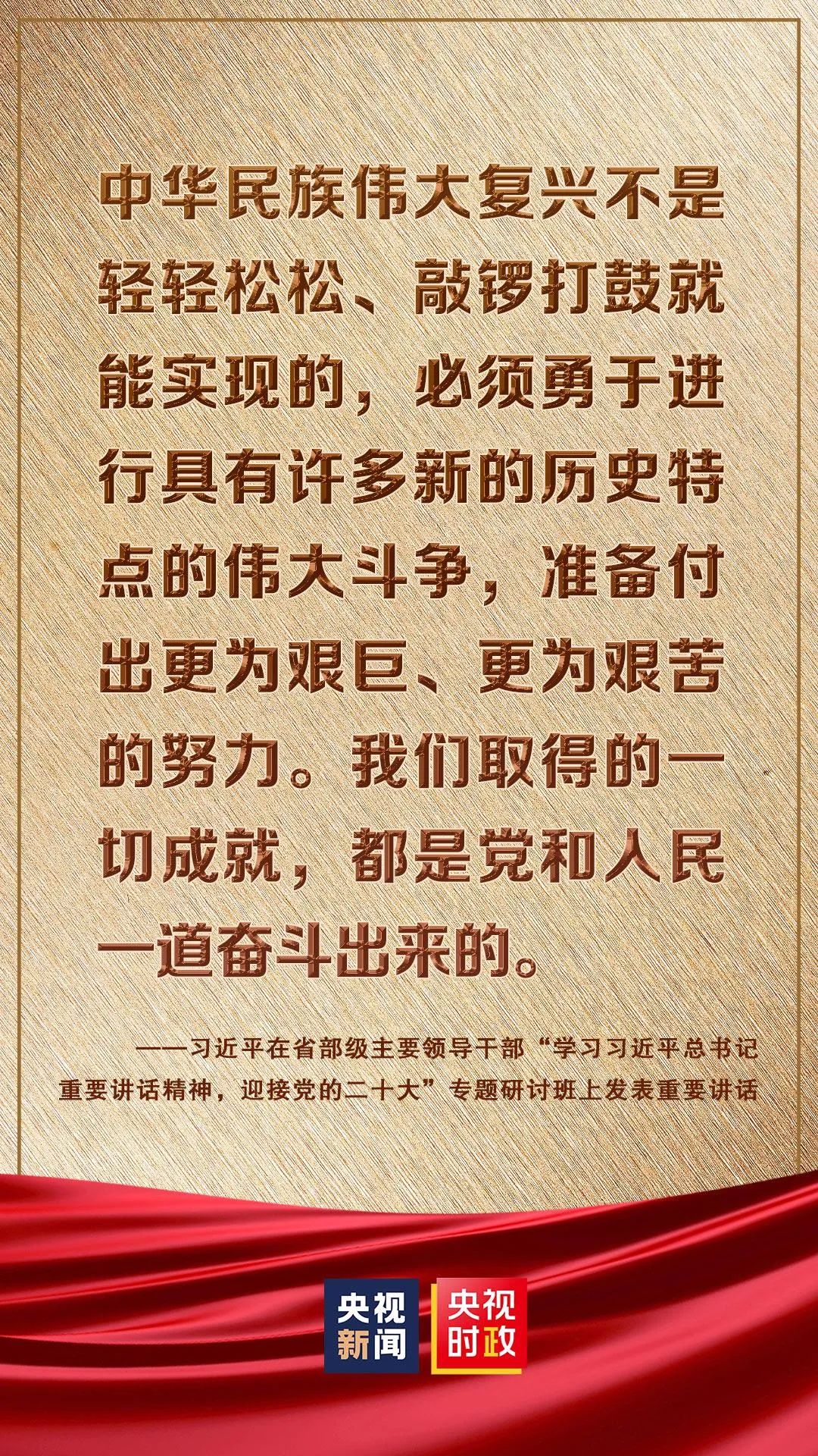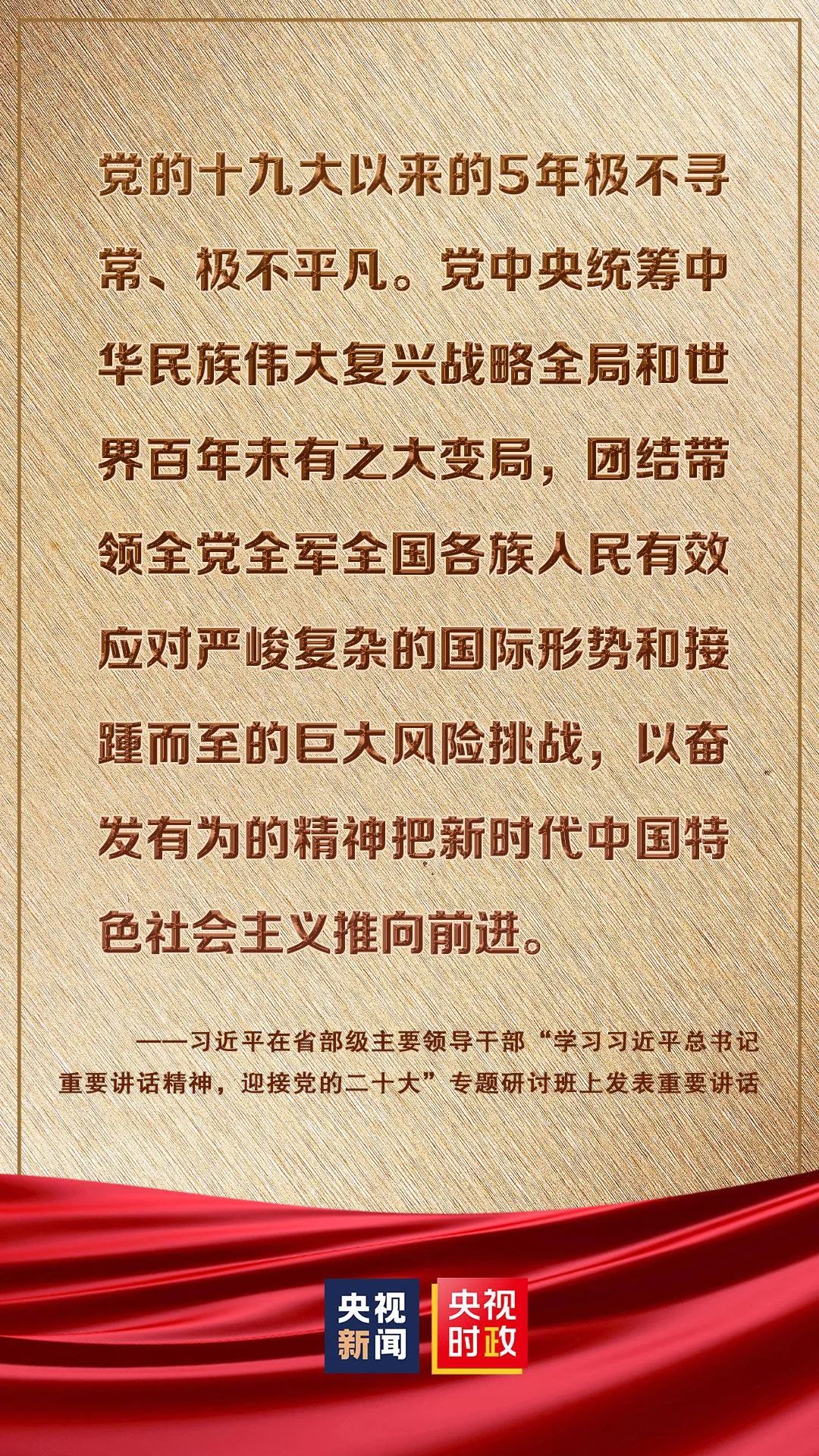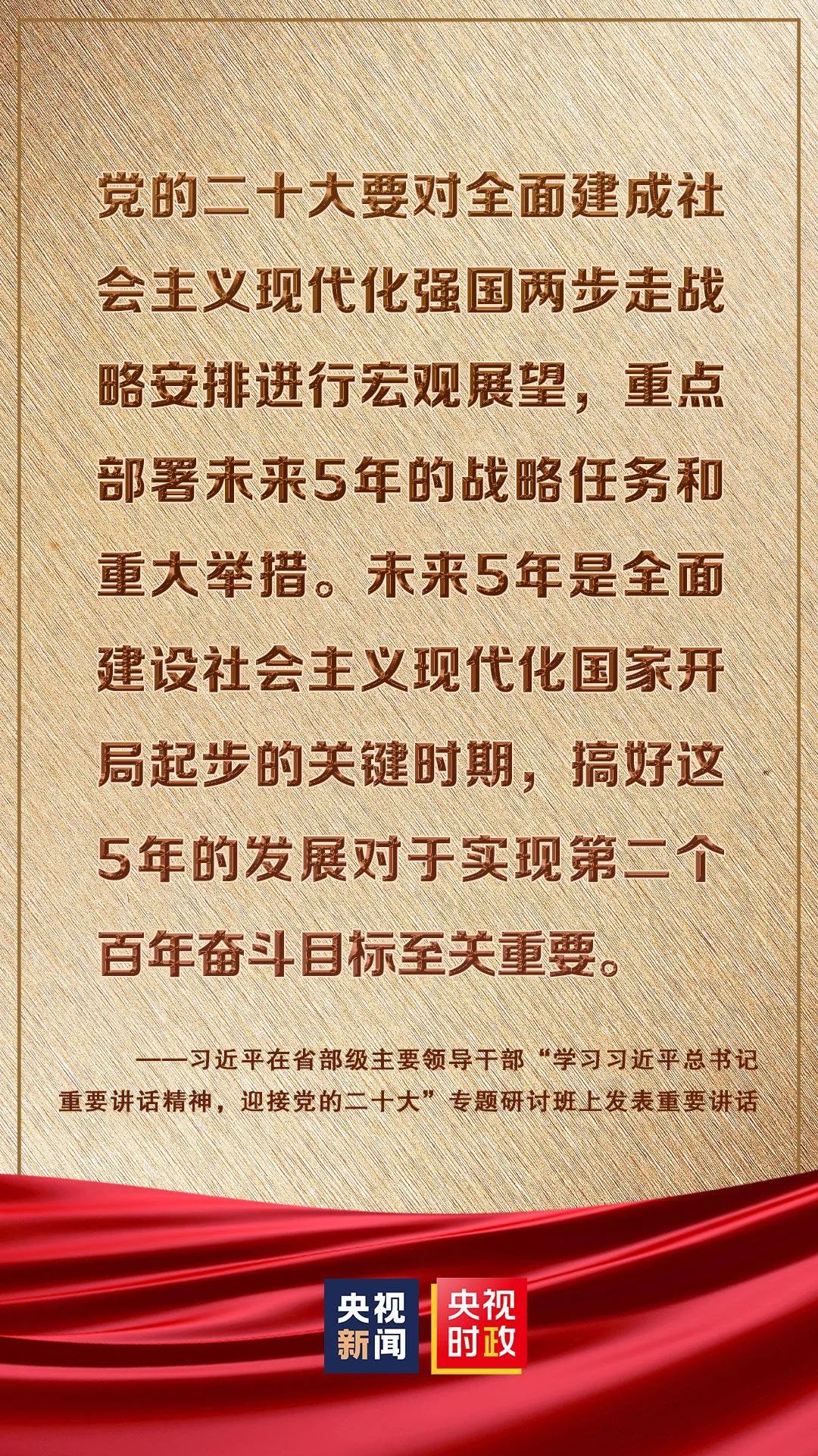 省部級主要領導干部“學習習近平總書記重要講話精神,迎接黨的二十大”專題研討班26日至27日在京舉行。中共中央總書記、國家主席、中央軍委主席習近平發表重要講話強調,在全面建設社會主義現代化國家、向第二個百年奮斗目標進軍的新征程上,全黨必須高舉中國特色社會主義偉大旗幟,堅持以馬克思主義中國化時代化最新成果為指導,堅定中國特色社會主義道路自信、理論自信、制度自信、文化自信,堅定不移推進中華民族偉大復興歷史進程。我們要牢牢把握新時代新征程黨的中心任務,提出新的思路、新的戰略、新的舉措,繼續統籌推進“五位一體”總體布局、協調推進“四個全面”戰略布局,踔厲奮發、勇毅前行、團結奮斗,奮力譜寫全面建設社會主義現代化國家嶄新篇章。