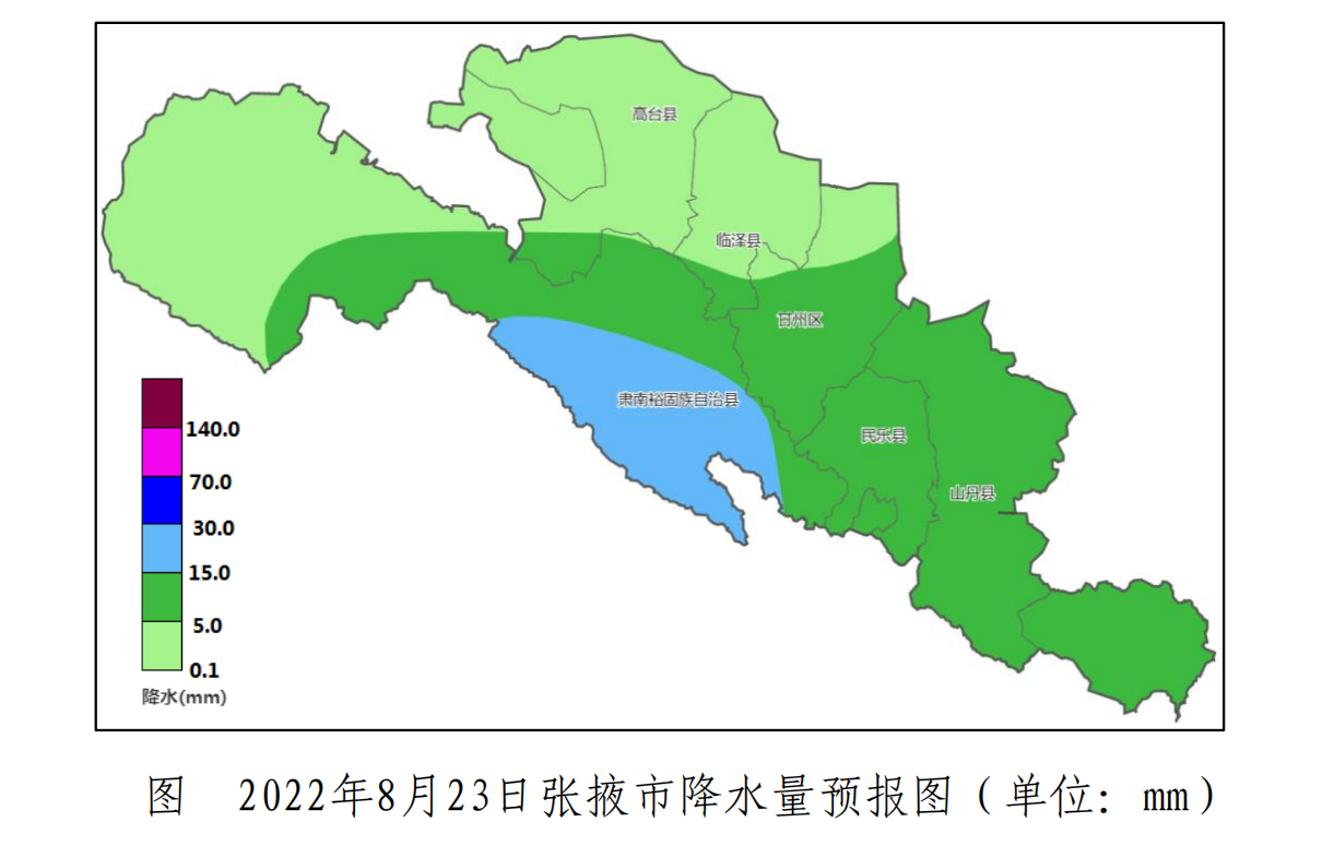 8月23日:高臺、臨澤小雨,甘州、山丹、民樂中雨,肅南中到大雨,西北風4-5級;氣溫:川區14℃~21℃,山區12℃~16℃。