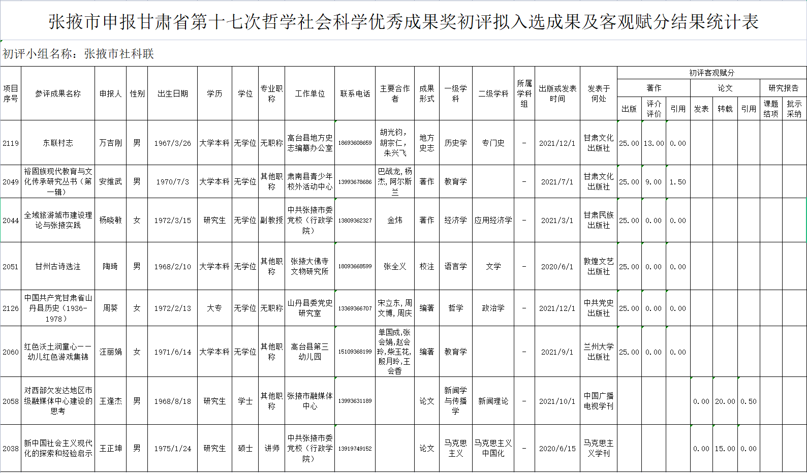 根據《甘肅省第十七次哲學社會科學優秀成果評獎實施細則》規定,經張掖市社科聯初評小組組織評委開展初評,評出張掖市申報甘肅省第十七次哲學社會科學優秀成果獎8項,現將張掖市申報甘肅省第十七次哲學社會科學優秀成果獎初評擬入選成果及客觀賦分結果予以公示,接受廣大社科理論工作者和社會各界監督。如發現公示的成果有剽竊、弄虛作假等問題,請以書面材料的形式向市社科聯初評小組辦公室反映。反映問題者須提供本人真實姓名、工作單位、聯系電話等有效信息(我們將予以嚴格保密)。凡匿名、冒名或超出期限的不予受理。