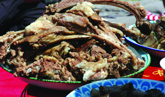 裕固族祖先過著草原游牧生活,以畜牧業生產為主,所以形成了獨特的飲食習俗。競幾先生在《歷代漢番茶馬互市考》一文中說:“番人夙以游牧,漁獵為主,故其食料多屬肉類,必以植物性食料以資調解。《明史?食貨志》云:‘番人嗜乳酪,不得茶則因以病。’《續文獻通考?征榷考》云:‘明邱溶謂:自唐世回絕以茶易馬,蓋西北嗜茶,有自來也,西北多乳酪,乳酪滯隔,而茶性通利,能蕩滌之。’”裕固族最典型的食品是牛、羊肉,有句俗語說“沒有羊肉不成席”,這是裕固族飲食習俗最真實的寫照。通常把羊肉做成手抓肉、羊背子(即把完整的羊臀尖帶骨煮熟上桌)、肉腸、脂裹肝和風干羊肉干等,也可全羊煮熟上桌;牛肉和羊肉的做法基本是一樣的。由于自然條件限制,裕固族很少吃新鮮蔬菜,而是以野蔥、沙蔥、野蒜、野韭菜和地卷皮(類似木耳)等各種野菜為主。奶茶在裕固族人民日常生活中占有十分重要的位置,民間有一日三茶一飯或兩茶一飯的習慣。即使水源充足,裕固族也提倡節約用水,炊具和餐具都要用草木灰不定期地消毒。裕固族傳統飲食一般都是就地取材,主要以牛羊肉為主,做法豐富,尤其在待客時非常講究。主人家要給客人準備羊背子,即按羊的不同部位把羊肉分成十二份羊背子,分別獻給不同身份、輩分、年齡的親戚和來賓,從頭背子到十二背子都有不同的稱呼,代表不同的輩分或身份。同時,將羊的臟器做成肉腸、脂裹干等。其他飲食還有糌粑,即將奶茶、酥油、炒面、曲拉、葡萄等拌勻捏成團,實際是一種自制點心,耐饑渴,適宜游牧時食用;鎖陽餅,將沙生植物鎖陽用木板刮去鎖陽皮,蒸熟后與面粉揉搓均勻,炸成油餅或烙成燒餅,味道香甜爽口;酥油炒面茶,就是加入酥油炒面的茶點,是裕固族日常生活中的主要飲食。除此之外,裕固族的主要飲食還有奶制品,用牛奶、羊奶為主制作的酸奶、奶皮子、酥油和曲拉等。裕固族忌食尖嘴圓蹄的動物,如馬、驢、騾、狗、雞、大雁、魚等,禁食牲畜和動物幼崽,不得在挖取野生食材時隨意破壞草場和植物生長環境。 2015年8月13日,裕固族飲食習俗被張掖市人民政府列入張掖市第三批市級非物質文化遺產代表性項目名錄。