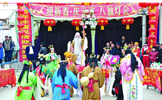 八仙燈會戲流傳于民樂縣豐樂鄉雙營村,是傳統的地方特色戲劇。該戲劇融合了地方特色戲劇表演與新春燈會,既有戲劇的表演特征,又具燈會的特點,形式獨特,別具一格,在西北地區極為罕見。八仙燈會戲由雙營村清代光緒時期的秀才何文楊始創,他以畢生精力創編了體裁獨特的八仙燈會戲劇本。其后,他的同族后代何永集又對八仙燈會戲劇本作了補充修改,至清同治八年(1869年)完成了八仙燈會戲的全部創作,于清光緒二十一年(1895年)正式上演。此后,每逢三年在元宵節期間演出。由于各種原因,劇本始終密不外傳,以至于后來劇本失落,只能口口相傳。中華人民共和國成立后,劇本都是由一代一代演職人員以口相授,世代沿襲。八仙燈會戲吸取儒、釋、道思想精華,選取人們熟知的八仙神話題材,借八仙之口,宣揚儒家的仁愛孝悌、佛家的因果輪回、道家的修心養性等思想,勸導世人修身仁愛、愛國愛家,思想內容豐富,寓意深刻。劇情分為王母上壽、八仙慶壽、天官賜福、香姑受封和達摩請神、劉海撒金錢兩個引子。在表演過程中,飾演八仙、童子、壽星、天官、王母等角色的所有演員在唱、念等表演中都要手持一盞手工制作的花燈,使戲劇表演錦上添花、絢爛奪目。在配樂上,采用當地人們喜歡的道情曲調,樂器以嗩吶為主,輔以板胡、二胡、笛子、古箏、樂鼓、銅鑼等,充分體現出本土特色。該劇演出規模大,參與人數眾多,演出場地需要在較為寬敞的廣場區域,不設舞臺,文武樂隊伴奏隨同左右,觀眾在周圍觀看。由于是三年演出一次,每次演出時,許多人早早等候,現場人山人海,場面極為熱鬧。觀眾一方面觀看燈會戲劇的熱鬧表演,另一方面競相請一個戲中八仙表演使用的燈籠掛在家中,以圖新的一年風調雨順、國泰民安、家庭幸福美滿。八仙燈會戲思想內容豐富,表演形式獨特,藝術感染力較強,自始至終貫穿著愛國敬孝、誠信友善、尊老愛幼、扶貧濟困、扶弱助殘、寬容禮讓等教化人心的精神和思想,反映了中華民族的傳統美德,表達了人民群眾祈盼社會和諧、國泰民安的美好愿望,深受廣大群眾喜愛。春節、元宵節燈展也是八仙燈會戲的重要組成部分,結合演出活動,將張燈、舞燈、觀燈、賞燈等活動穿插其中。正月十三上燈,十四試燈,十五展燈,十八落燈,整個活動才落下帷幕。 2015年8月13日,八仙燈會被張掖市人民政府列入張掖市第三批市級非物質文化遺產代表性項目名錄。保護單位:張掖市民樂縣文化館。
