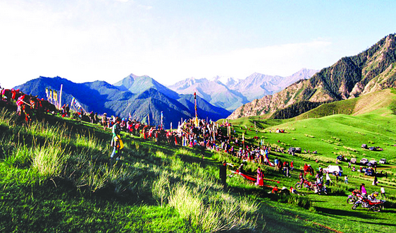 祭鄂博儀式是裕固族先民原始宗教信仰——薩滿教的一個重要儀式,歷史悠久,且隨裕固族發展變遷而不斷豐富。裕固族先民改信佛教后,祭鄂博儀式也隨之演變,成為兩種信仰的有機結合。祭鄂博形式為:在山頂、山岔、山坡或平坦地帶,用石頭壘一山包或方斗形的城堡,中間插上5—6米長的松木桿子,桿頭削尖染紅后,栓上各色羊毛繩、布條、哈達等,周圍也拉上羊毛繩,把印有經文的哈達、布條拴在上面。祭祀這天,各家帶奶酪、燒酒等祭品來到鄂博前參加祭祀儀式。每家每戶都要準備尖端纏有羊毛的新木桿,插在鄂博上,人們或徒步或騎馬圍繞鄂博轉圈,并灑上奶酪、燒酒等祭品,再在四周點火、燒香,請寺院僧人念經。然后,將一只專門喂養、從未剪過羊毛的“神羊”牽出,在“神羊”右肩上拴上紅、綠布條,頭上抹些酥油,再朝頭、背處澆水,當“神羊”全身顫抖時,宰殺祭獻鄂博,祈求它消災免難,保佑家家平安。祭畢,人們將羊背肉割下酬謝寺院僧人,余者由參加祭祀的人處理。祭鄂博每年進行一次,由寺院僧人選定時間,大致在農歷六月份舉辦,也有在農歷二月初二或四月二十一舉辦的。目前,肅南縣只有皇城、康樂、大河、祁豐等鄉鎮的極少部分村落有祭鄂博習俗,而且儀式越來越簡化,傳承人也呈現老齡化。祭鄂博儀式既反映了裕固族先民對日、月、雷、電和天的原始崇拜思想,也反映了由信仰薩滿教向信仰藏傳佛教的演變痕跡,對研究裕固族形成發展歷史、究西部民族文化交流,尤其是宗教文化的交流融合具有重要價值。 2008年6月13日,裕固族祭鄂博被甘肅省人民政府列入第二批甘肅省非物質文化遺產代表性項目名錄。保護單位:張掖市肅南縣裕固族文化研究室。