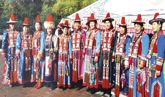 肅南裕固族自治縣位于甘肅省西北部河西走廊、祁連山北麓。全縣總面積2 . 38萬平方公里,是一個以裕固族為主體,藏、漢、蒙古、回、土等1 1個民族聚居的縣,人口3 . 58萬,其中裕固族是全國唯一、甘肅省獨有的人口較少民族之一。裕固族婦女有戴帽子習慣。這種帽子是用白色羊毛壓制的氈子制成,前緣鑲有兩道黑邊,帽沿不寬,后沿微翹,前沿平伸,帽頂綴有紅線穗子垂在帽頂周圍。有的還飾有各色花紋,戴在頭上像一只倒扣的喇叭,很是別致。未婚少女的前額戴“格堯則依捏”,即在一條長紅布帶上邊綴以珊瑚珠,下邊緣是用紅、黃、白、綠、藍五色的珊瑚和玉石小珠串成的許多穗,它像珠簾一樣齊眉垂在前額。梳五條或七條發(fā)辮,辮梢內(nèi)有彩色的絲絨線,系在背后的腰帶里。男子頭戴金邊白氈帽,帽沿后邊卷起,后高前低,呈扇面形。也有的帽沿鑲黑邊,帽頂正中有在藍緞上金線織成的圓形或八角形圖案。裕固族服飾,是裕固族人的傳統(tǒng)服飾。裕固族男女都穿高領(lǐng)、大襟有衽的長袍。男子束紅、藍腰帶,佩帶腰刀、火鐮等;而婦女高領(lǐng)長袍下擺開衩,衣領(lǐng)、袖口、衣衩、襟邊繡著花邊。外套大紅、桃紅、翠綠、翠藍色的緞子高領(lǐng)坎肩,系紅、綠、藍色腰帶,配彩色手帕,腳穿長筒皮靴。冬季,男女皆戴狐皮風雪帽,穿高筒靴;夏秋戴圓筒平頂鑲邊的白氈帽或禮帽。婦女頭戴喇叭形紅纓帽或用芨芨草編織的帽子,喜歡佩戴耳環(huán)、翡翠或玉石手鐲及銀戒指等。 2008年6月7日,裕固族服飾經(jīng)國務院批準列入第二批國家級非物質(zhì)文化遺產(chǎn)代表性項目名錄。保護單位:張掖市肅南裕固族自治縣裕固族文化研究室。
