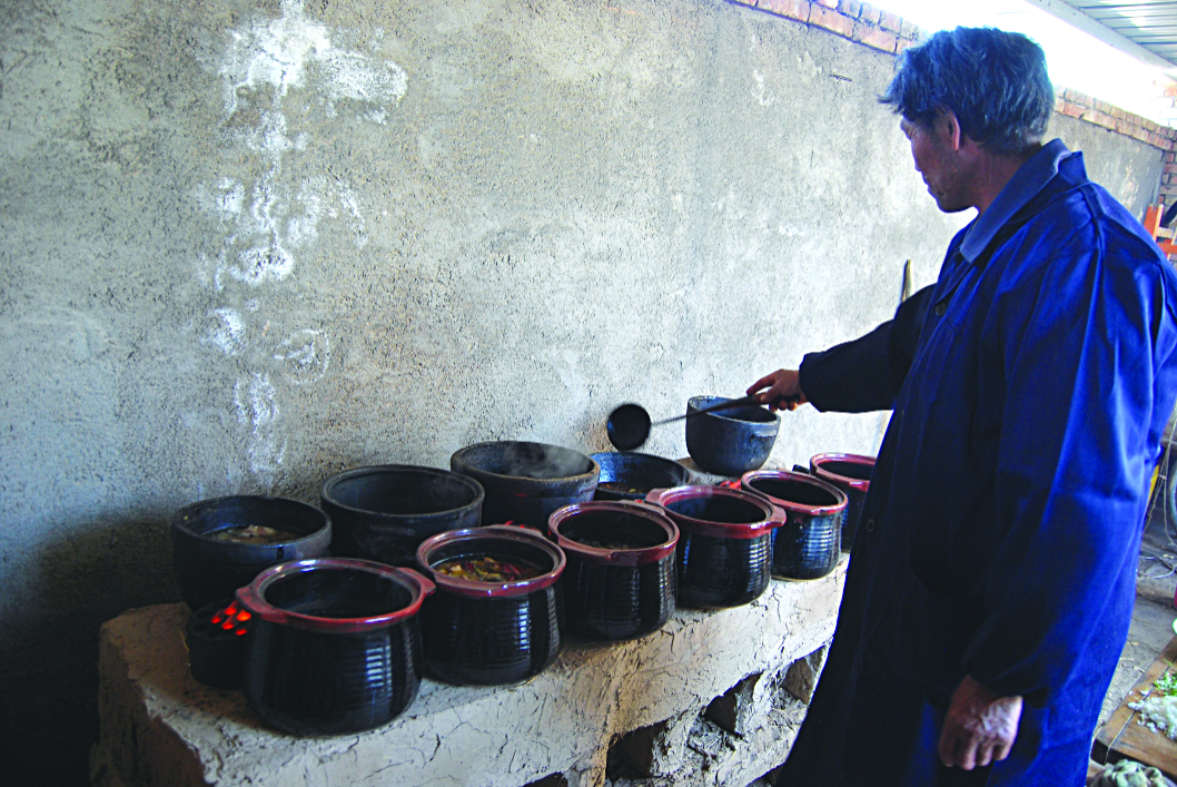 罐罐席是20世紀80年代以前山丹縣農(nóng)村舉行宴席的主要方式,其主要特點是主菜(即俗稱十大碗)均由砂罐燉制而成,故稱罐罐席。 舊時,山丹宴席根據(jù)費用情況可分三個檔次,均為罐罐席。最高檔次是十二樓全席(亦稱雞肘席),用料較多,花費較大,一般人家無力承擔,中華人民共和國成立后基本失傳;比較普遍的是十全席,即除涼菜和炒菜外,上十大碗主菜(砂罐燉制而成);經(jīng)濟情況非常困難的一般是“五碗一盤”,就很簡陋了。 罐罐席上菜的順序一般是:客人坐好之后,先上8個涼菜(俗稱水菜);之后上炒菜(俗稱梢子),梢子有兩種上法,或是“一平一立”,即一碗一碟,或是“紗帽翅”,即四碗兩碟;炒菜撤去后上十大碗;十大碗之后開始上酒。另外,上十大碗時,每上一碗須向客人敬酒一杯。其中,每碟菜根據(jù)菜的材質(zhì)不同都有一定的擺放位置,不可隨意擺放,總體體現(xiàn)出一個尊老的禮儀。 罐罐席的主食一般是花卷8個,包子8個,油餅8塊。 十大碗的主要內(nèi)容是五葷五素,五葷指豬肉塊燉菜(俗稱紅燉)、豬肉片燉菜、羊肉燉菜、牛肉燉菜、丸子燉菜,五素是指燴蘿卜、燴土豆、燴葫蘆、燴豆腐、燴面筋。 罐罐席每桌8人,最上首由年齡最長或威信最高者就座。每道菜上來后,最上席先動筷,其他人方可動筷。上席若放下筷子,其他人也得放下筷子,陪著聊天。 罐罐席在山丹歷史悠久,流傳甚廣,具有濃郁的地方特色,深受群眾喜愛。其特點:一是根據(jù)當?shù)剞r(nóng)畜產(chǎn)品選料,就地取材;二是以燉制為主,不加任何現(xiàn)代調(diào)味品,原汁原味,菜味醇正;三是富含民俗禮儀內(nèi)容,教化風俗。 隨著經(jīng)濟和社會的發(fā)展,現(xiàn)在罐罐席已退出人們的生活。但是,現(xiàn)在人們的飲食,尤其是宴席非常鋪張,造成大量浪費。所以,重新挖掘整理罐罐席,并在改進之后加以推廣,具有極強的社會意義和經(jīng)濟意義。 2015年8月13日,山丹罐罐席(張掖地方風味小吃制作技藝)被張掖市人民政府列入張掖市第三批市級非物質(zhì)文化遺產(chǎn)代表性項目名錄。 保護單位:張掖市山丹縣文化館。