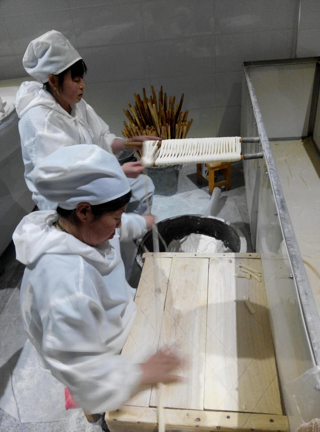 手工拉面加工工藝始于明末清初的傳統手工拉面,至今已有400年的歷史,經過歷代祖傳,工藝臻于完善,掛面以適口、細膩、美味歷來受到消費者的青睞,至今久銷不衰。手工拉面是人類社會傳統飲食文化的體現,它是一種綠色食品,以美味、美觀、營養好,而流傳至今。銀河集團公司于1999年新建手工拉面車間,聘請豐樂鄉雙營村掛面工藝第九代傳人何多儉授藝,嚴格傳承了民間世代相傳的掛面工藝,結合近年來消費習慣的變化、生產加工需要和產品質量要求,銀河集團公司鄧福元做為雙營何氏掛面的第十代傳人同公司技術人員對銀河拉面的工藝在傳統工藝的基礎上進行了科學的改進,改進后的工藝特點是工藝流程沒有改變、手工操作繼續保留,剔除了食用油的添加,變晾曬干燥為強制通風自然陰干。改進工藝使拉面生產擺脫了受自然氣候的影響,產品質量更加穩定、無添加食用油因存放時間過長酸敗的氣味,使掛面加工程序化、規模化。 “手工拉面加工工藝“制作掛面主要采用當地產的旱地小麥面粉(高精面粉),通過和面、壓面、搓大條、搓小條、醒面、開面、上面、風干、卸面、切割理面、包裝等11道大工序精制而成,手工拉面特點細如絲、清如白玉,而且口感好,好看好吃,營養價值也很高。相傳在清代乾隆年間,甘肅徽縣大旱,莊稼顆粒無收,一位老人帶領一家三口為逃饑荒流落到民樂地界,為生計他就將自己掌握的制作掛面的手藝傳授給與鄉人,掙點口糧苦度日月。采用他傳授的方法制作的掛面細膩、光滑、白凈、韌性強,口感好深受深受人們青睞。特別是年老體弱者常之食用,易于消化吸收,增進營養,延年益壽;一時間掛面成為走親訪友,老人祝壽,相互饋贈的高檔食品。幾年間在民樂各村鎮出現了以掛面為業的掛面匠,至此手工拉面的技藝在當地盛行并流傳了下來。甘肅銀河集團公司采用的傳統手工拉面工藝生產的銀河牌拉面,因其條細、光滑、有筋力,口感爽滑,受到廣大消費者的認可和贊譽。銀河拉面經過近十多年的發展生產工藝更加完善、產品質量穩定提高,成為銀河禮品重要組成部分。2016年實現銷售收入180萬元/年、利稅23萬元。