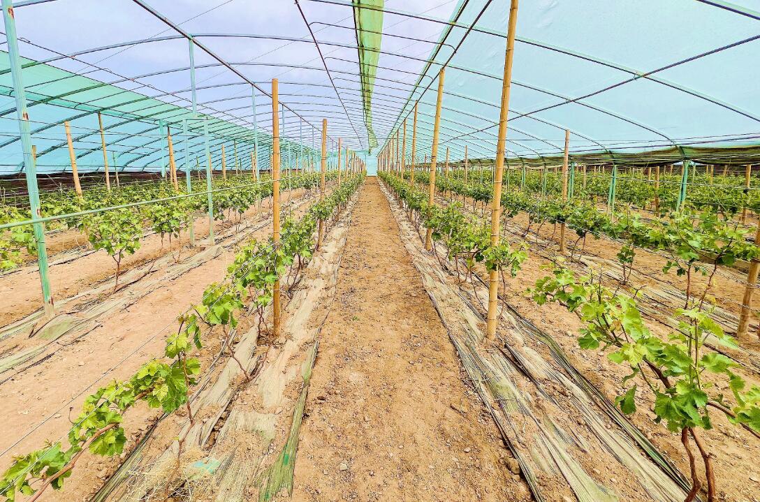 “我們充分發揮技術優勢,創新栽培模式,采取“暖棚延晚”模式,持續擴大設施葡萄產業種植規模,已完成土地平整3000畝,建成設施拱棚400座,配套完善2.5萬立方蓄水池、高低壓線路、產業園道路等基礎設施?!卑鍢蜴偢辨傞L劉增武介紹說。