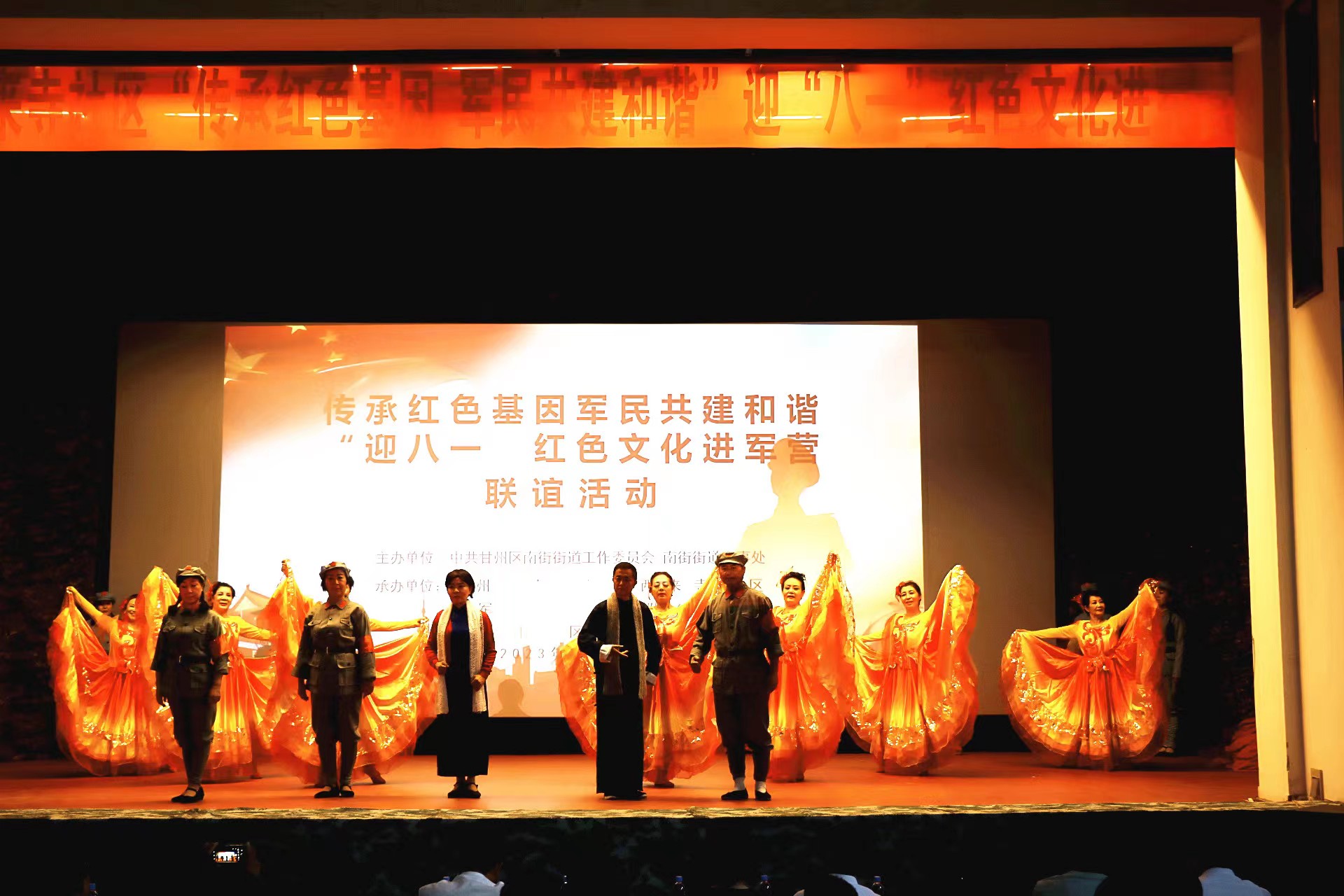由社區(qū)銀齡先鋒志愿者帶來(lái)的紅色經(jīng)典情景劇《我們?nèi)f眾一心》拉開(kāi)了晚會(huì)序幕,將臺(tái)下的官兵和觀眾帶進(jìn)了黨的百年光輝的歷程,解放軍戰(zhàn)士表演的節(jié)目節(jié)目彰顯出軍人的風(fēng)采,讓臺(tái)下的觀眾一睹了錚錚鐵骨、氣度不凡的軍人氣魄,大學(xué)生表演的小合唱《祖國(guó)不會(huì)忘記》喚起了青春的朝氣,請(qǐng)黨放心強(qiáng)國(guó)有我,紅色故事《為了新中國(guó)前進(jìn)》彰顯了英雄為了國(guó)家、為了人民粉身碎骨視死如歸的精神。《白發(fā)親娘》《裕固歡歌》等舞蹈展現(xiàn)了社區(qū)居民的文明風(fēng)范,演員們精彩的表演,贏得了現(xiàn)場(chǎng)觀眾叫好連連,現(xiàn)場(chǎng)洋溢著歡快、熱烈、喜氣洋洋、積極向上的氣氛。充分體現(xiàn)了軍愛(ài)民,民擁軍所取得的成果,展示了軍民魚(yú)水一家親,攜手共建和諧的美好場(chǎng)景。演出結(jié)束后,社區(qū)為部隊(duì)官兵贈(zèng)送了《甘州紅故事》《紅西路軍征戰(zhàn)河西史》等紅色故事書(shū)籍,甘州區(qū)圖書(shū)館也向解放軍指戰(zhàn)員贈(zèng)送了書(shū)畫(huà)作品。