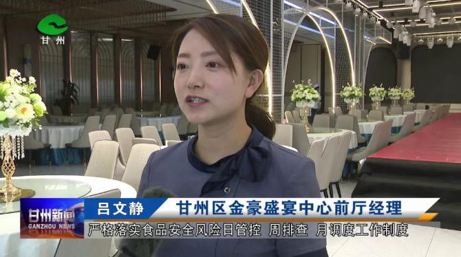 記者在甘州區(qū)金豪盛宴中心看到,店內(nèi)的餐具、器皿、桌布、椅套等擺放有序,食品安全標語標牌隨處可見。