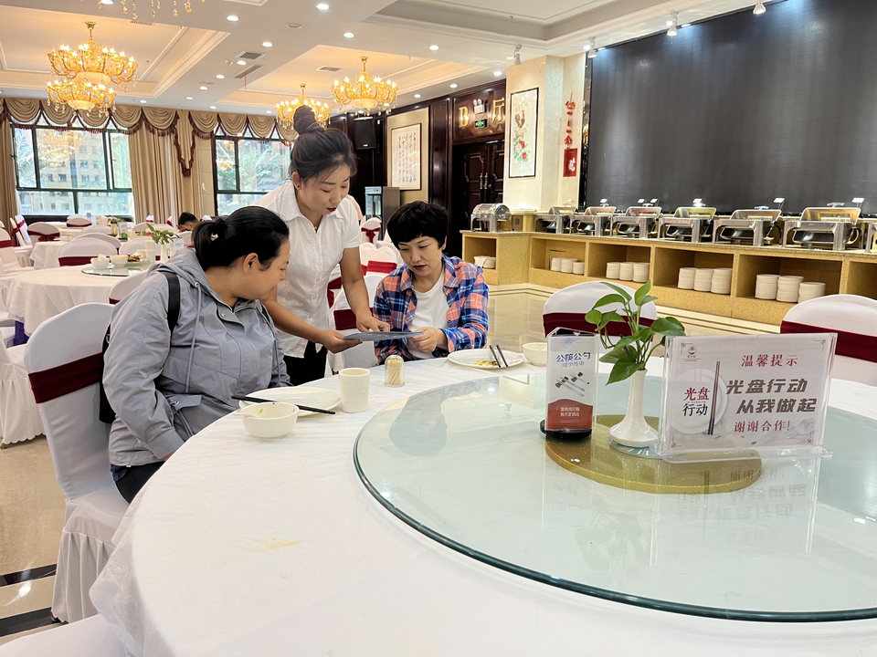 在二樓餐廳,酒店服務向就餐游客進行“光盤行動”的溫馨提示,引導顧客理性消費、勤拿少取、按需點餐。