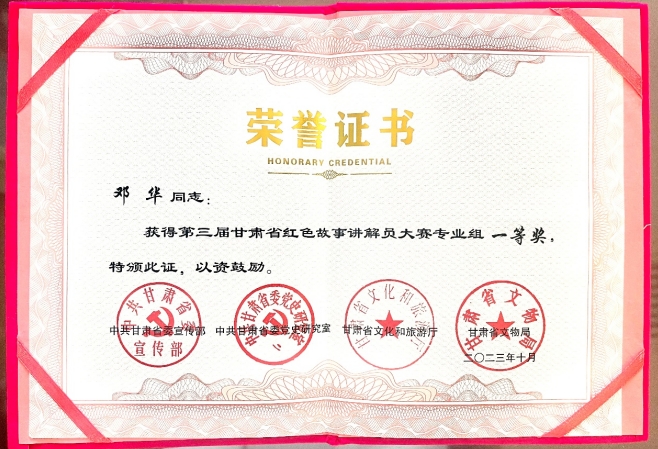 中國張掖網高臺訊 近日,由中共甘肅省委宣傳部、甘肅省委黨史研究室、甘肅省文化和旅游廳、甘肅省文物局共同舉辦的第三屆甘肅省紅色故事講解員大賽暨第四屆全國紅色故事講解員大賽甘肅賽區選拔賽在蘭州圓滿落幕。中國工農紅軍西路軍紀念館推選的講解員鄧華在比賽中獲得專業組一等獎。