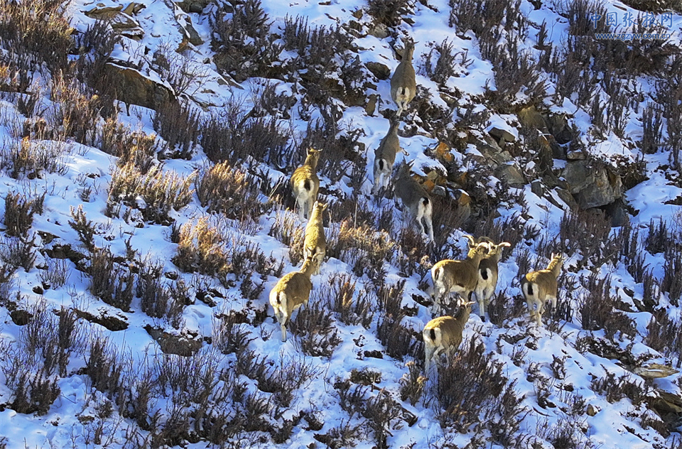 中國張掖網民樂訊 11月16日,張掖市民樂縣公安局森林警察大隊民警在海拔2800米的扁都口林區利用無人機巡護時,拍到一大群巖羊在雪地覓食、奔跑的珍貴畫面。數量達200只左右,場景壯觀。