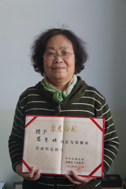 高愛玲,女,1952年4月出生,1969年參加工作,一直從事糧食保管工作。不論在哪個工作崗位上,她都任勞任怨,盡職盡責。為了不使糧食受損,她不分白天黑夜,隨叫隨到為倉庫糧食鋪蓋篷布。負責保管的糧食賬簿記載清楚,日清月結(jié)。糧食保管嚴格按照規(guī)范要求,按制度規(guī)定勤檢查,從未出現(xiàn)霉變、生蟲、短少等問題。她還熱情的為交糧農(nóng)戶服務(wù),積極搭栓畜棚,想方設(shè)法方便群眾交糧,深受群眾的好評。因其工作成績突出,表現(xiàn)優(yōu)異,于1997年榮獲張掖市“勞動模范”榮譽稱號。