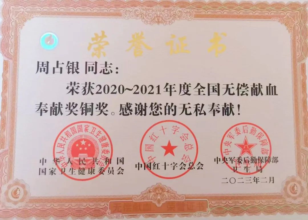 不善言辭的周占銀從來都沒有宣揚過自己獻血的事情,但是卻深深地影響著身邊的人。“剛開始,家里人不太同意我獻血,擔心對身體不好,后來看著我一次次去獻血,身體非但沒垮,反而比以前更結實了,大家的態度才從反對轉變為支持。”如今,周占銀的子女也加入到了無償獻血的隊伍中。