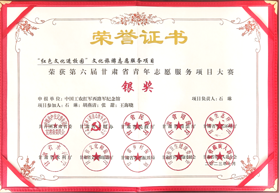 近年來,中國工農紅軍西路軍紀念館牢記習近平總書記殷切囑托,探索“紅色宣講+志愿服務”模式,為省內外青少年常年開展愛國主義、革命傳統、國防科普教育等志愿服務,通過打造“行走中的紀念館”、“網上紅館”和推出VR虛擬展館等方式,讓靜默的文物、流動的展覽、豐富的志愿活動成為最生動的教材、最直觀的教具和最好的教科書,志愿服務工作成效顯著。該館打造開展的“紅色文化進校園”文化旅游志愿服務品牌在第六屆甘肅省青年志愿服務項目大賽中榮獲銀獎。