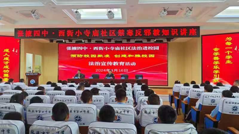 中國張掖網甘州訊 為提高青少年學生的法治意識,增強青少年學生的識毒、防毒、拒毒的能力,4月16日,甘州區西街街道小寺廟社區攜手張掖四中共同開展禁毒、反邪進校園活動。