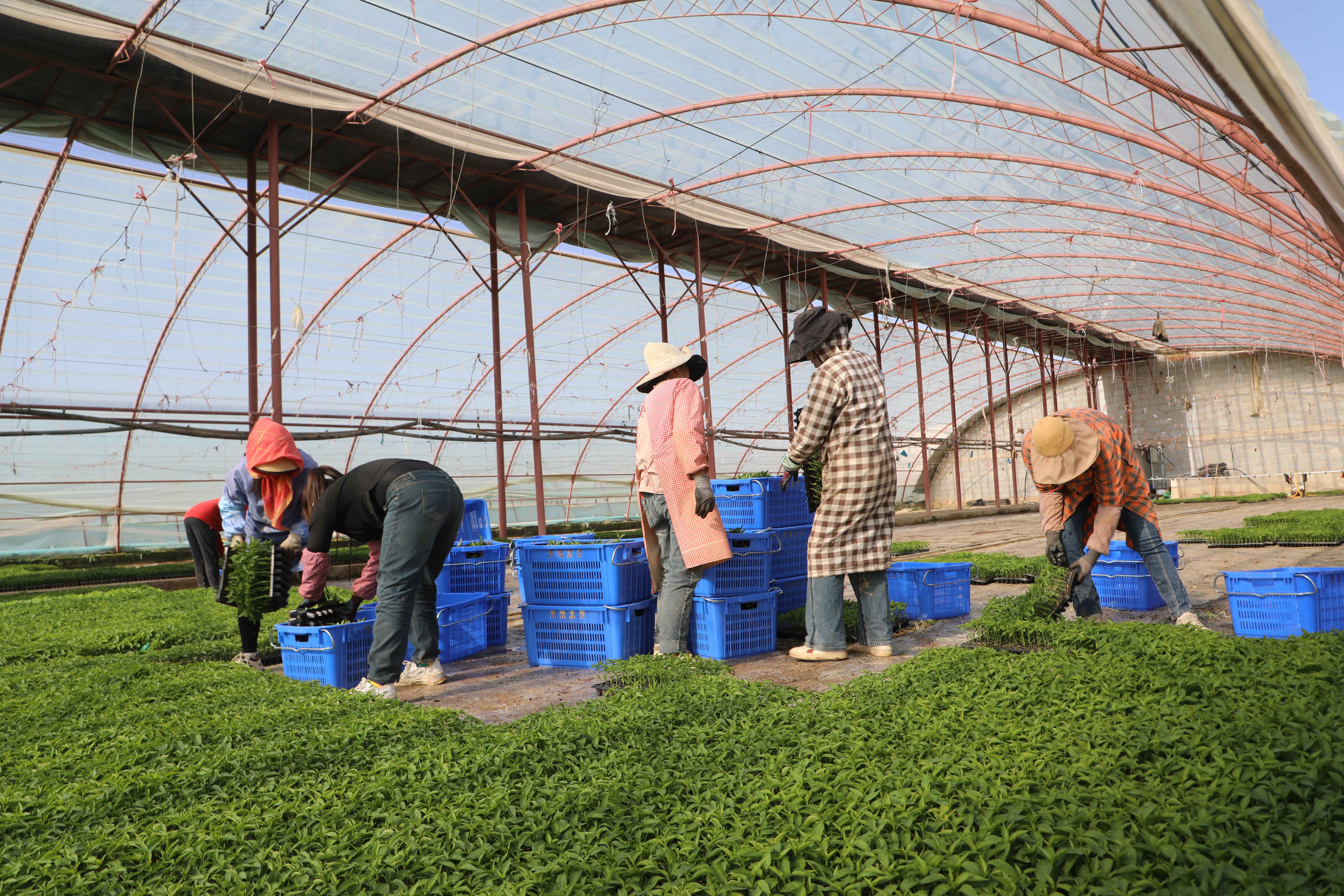 走進汪家墩設施農業示范園區,一壟壟青翠欲滴的朝天椒菜苗映入眼簾,在溫暖的環境中,苗肥葉壯、長勢喜人,大棚內綠意盎然、生機勃勃,吸引了不少周邊客商前來采購。工人們正在有序開展起苗、裝苗工作,并將打包好的菜苗送往各地。