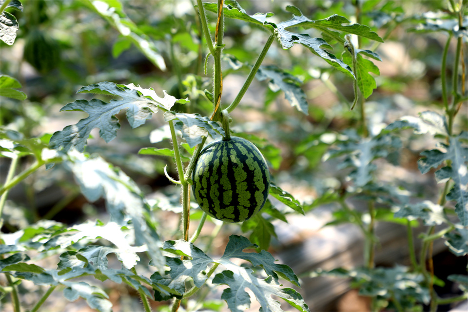“別看它個頭小,但皮薄肉多、爽口甘甜、水分充足,口感和品質都非常好,吊蔓種植后,實現立體栽培,西瓜四面陽光均勻照射,也便于整蔓、打杈、掐尖、摘果,同時,通過采用人工授粉,提高了瓜秧坐果率,實現增產增效。”劉振華說。