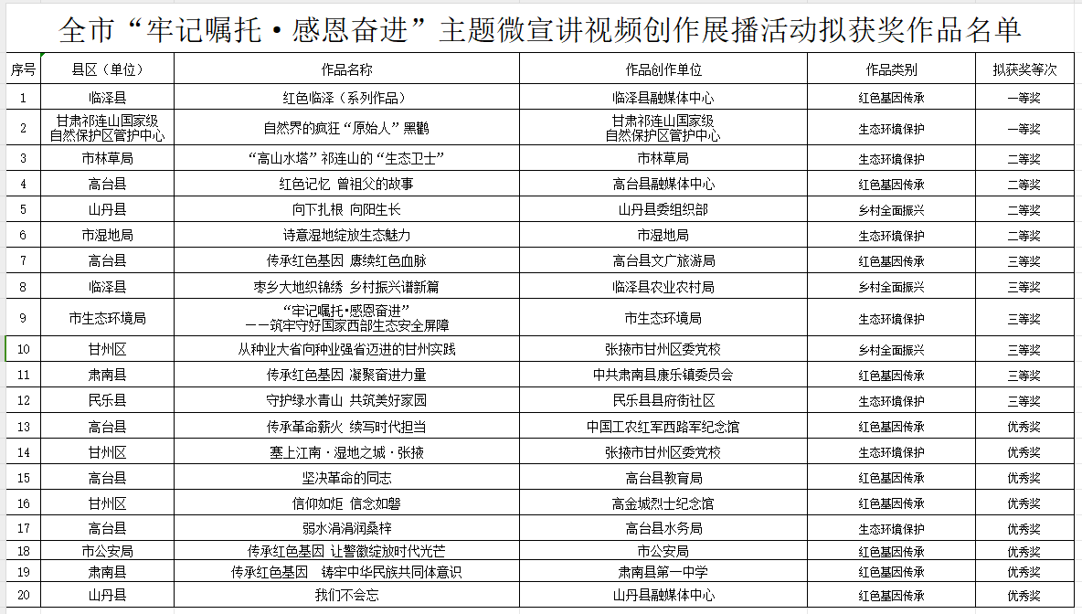 根據《全市“牢記囑托·感恩奮進”主題微宣講視頻創作展播活動工作方案》要求,經縣區(部門)推薦、市上組織評審,擬確定《紅色臨澤(系列作品)》等20部作品為全市“牢記囑托·感恩奮進”主題微宣講視頻創作展播活動獲獎作品,擬確定高臺縣委宣傳部、市公安局等兩個單位獲優秀組織獎,現予以公示。公示期間,接受廣大干部群眾和社會各界監督,如有異議,請以電話或書面材料的形式向市委宣傳部反映,反映問題者須提供本人真實姓名、工作單位、聯系電話等有效信息(我們將予以嚴格保密)。凡匿名、冒名或超出期限的不予受理。