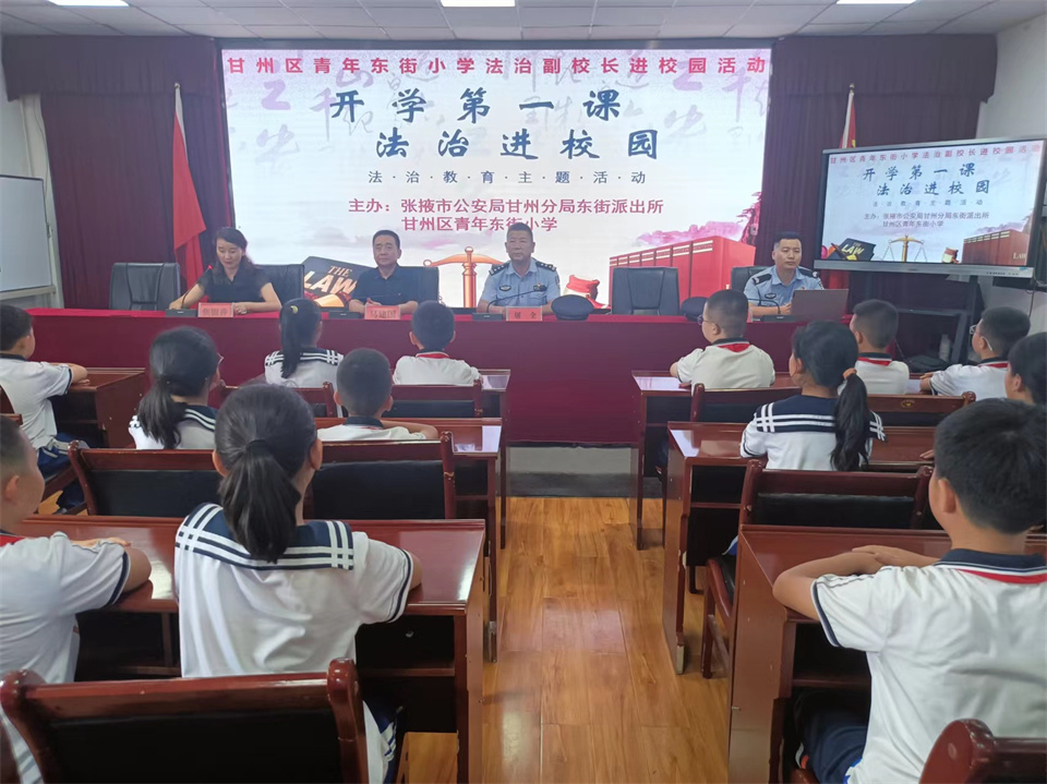 中國張掖網甘州訊 為進一步深化校園普法教育,加強對未成年人的保護力度,防范未成年人犯罪事件發生,營造平安良好的校園氛圍,在8月27日開學之際,甘州區青年東街小學特邀該校法治副校長,張掖市公安局甘州區分局東街派出所所長屠全及相關民警走進學校,為師生送去了新學期的“第一堂課”。