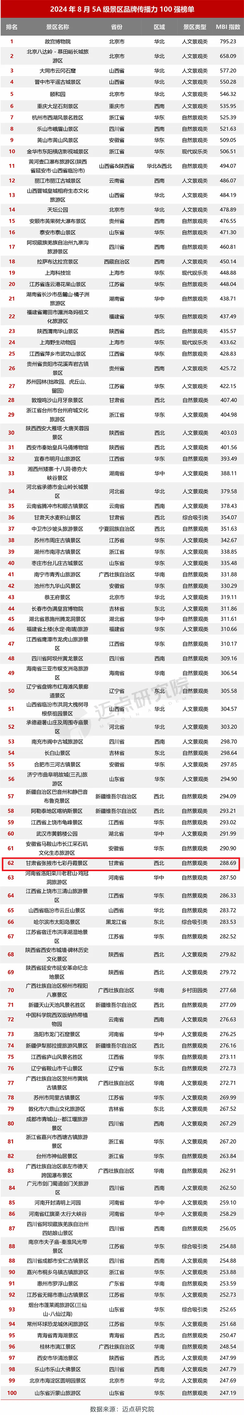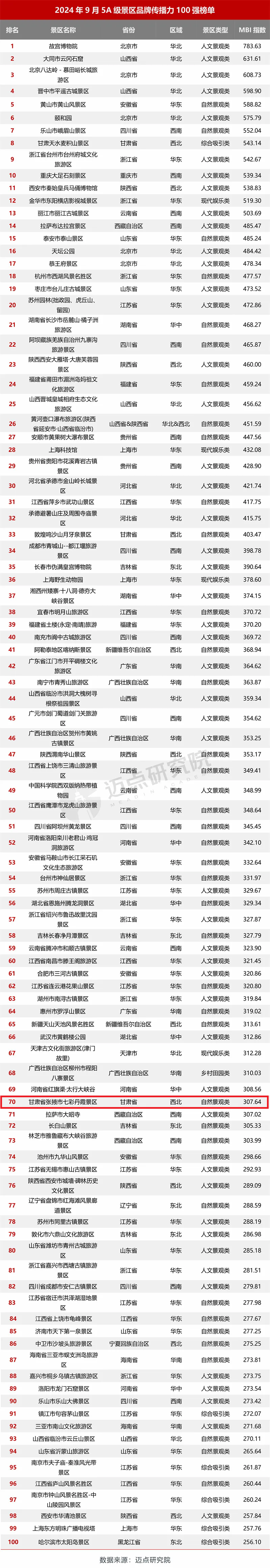 中國張掖網訊 近日,國內文旅行業權威數據分析機構“邁點研究院”發布《2024年9月5A級景區品牌傳播力(MBI)100強榜單》,張掖七彩丹霞景區上榜,位列全國5A級景區第70位,MBI指數307.64。這是該景區連續2月上榜該排行榜,其中,8月位列全國5A級景區第62位,MBI指數288.69。
