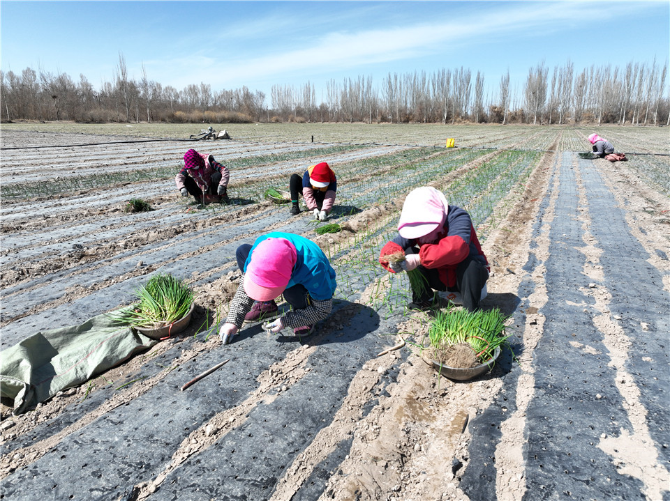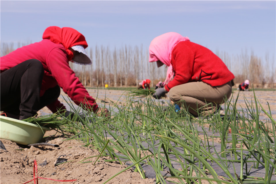 “自己的地已經種完了,我們就閑下來了。前幾天我家老常聽說附近招工就來這邊打孔,最近我也約了幾個好姐妹來這里移栽大蔥,一天能賺200多塊,誰說女子不如男!”不服輸的黑泉鎮十壩村村民于海燕邊干邊說。像于海燕這樣在家門口圓了就業夢的村民不少,去地里“上班掙工資”成了黑泉鎮的新風尚。