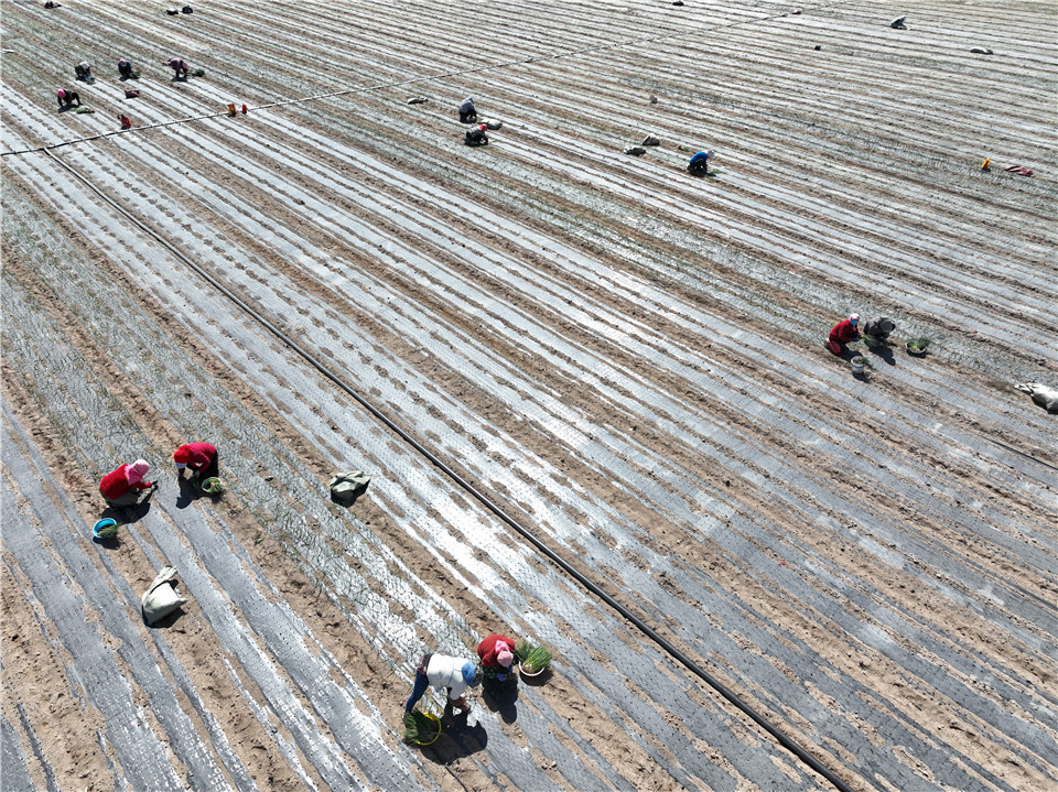 起壟覆膜、搬運蔥苗、培土栽種、精準滴灌……高臺縣黑泉鎮沙溝村百畝大蔥種植基地一派繁忙景象。幾十名男工正手持農具,在壟間進行田間作業,轉瞬之間,地膜上布滿了整齊均勻的栽蔥小孔等待蔥苗“入住”。與此同時,另一邊的幾十名女工則在有序地分揀、搬運、栽種,不一會兒,一排排蔥苗就整齊地扎根在地壟里,田野間生機盎然,充滿希望。