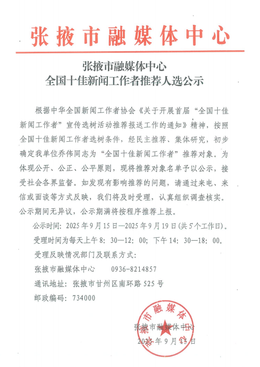 張掖市融媒體中心全國十佳新聞工作者推薦人選公示
