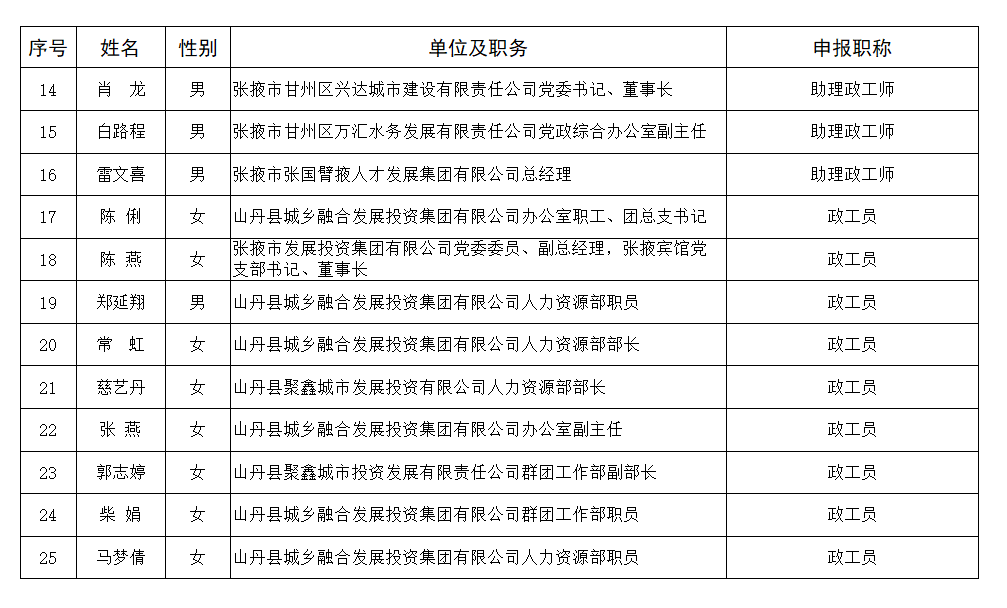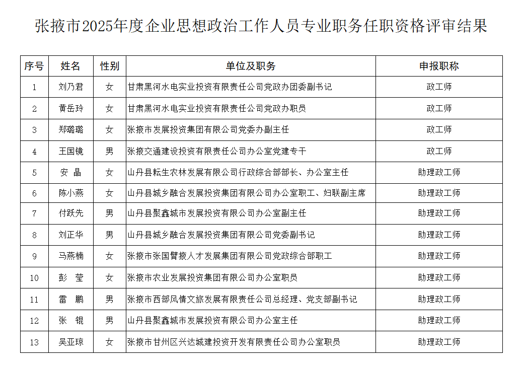 關于2025年度張掖市企業政工人員專業職務任職資格評審結果的公示